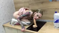 In a dimly lit and passionate kitchen, the womans piercing tattoos and bright socks were the first things to catch anyones attention as she eagerly climbed onto the counter.Her long braids swayed with the rhythm of her movements, adding an erotic flair to her appearance.With eyes locked onto one another, the attraction between this couple was undeniable there was an air of anticipation in the room.As their lips met in a passionate embrace, they exchanged eager kisses while caressing each others bodies.The woman reached down and began to stroke the dildo, slowly teasing herself as she prepared for what lay ahead.Her moans intensified with each thrust, her body contorting and arching off the counter as she reveled in the pleasure it brought her.With every plunge of the dildo, she felt herself closer to orgasm, her breathing becoming heavy and fast, her cunt throbbing for release.The man could no longer deny his hunger for her and soon joined her on the kitchen counter, positioning himself perfectly as he started to suck on her engorged clit.His tongue danced around it in sync with her movements, driving her wild with desire.Her body trembled under his expert touch she had never felt so wanted and alive.Her cunt became slicker, dripping with need, a clear sign of how close she was to climax.The man pulled away momentarily, giving her just enough time to breathe before resuming their rhythm, pushing her harder and faster toward the edge.Suddenly, a fun more powerful than she had ever experienced ripped through her core she let out a guttural scream as wave after wave of pleasure engulfed her entire body, shaking her to her very core.The man pulled away just long enough to take in the sight before him her face flushed and drenched in sweat as she convulsed in passions grasp.As he stood to his feet, the couple shared a knowing glance of mutual satisfaction, the connection between them deepening.With one more passionate kiss, they shared each otherâs breath, ready for yet another round of pleasure and desire on the kitchen counter, where it all began.